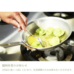 [臨時休業のお知らせ]3月6日(水)〜14日(土)、社員研修のためお休みをいただきます。15・16日の定休日を経て、17日(火)ランチタイムより通常営業です。